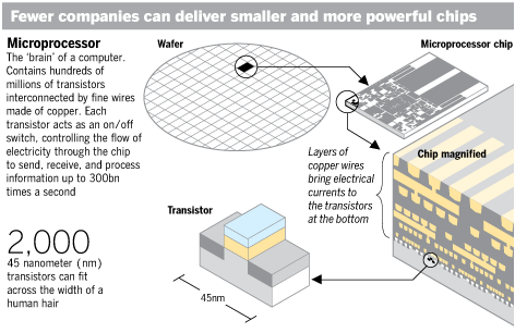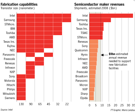 “Intel argues that only companies with about $9bn in annual revenues can afford to be in the business of building new fabs, given the costs of building and operating the factories and earning a decent 50 per cent margin. That leaves just Intel, Samsung, Toshiba, Texas Instruments and STMicroelectronics.”