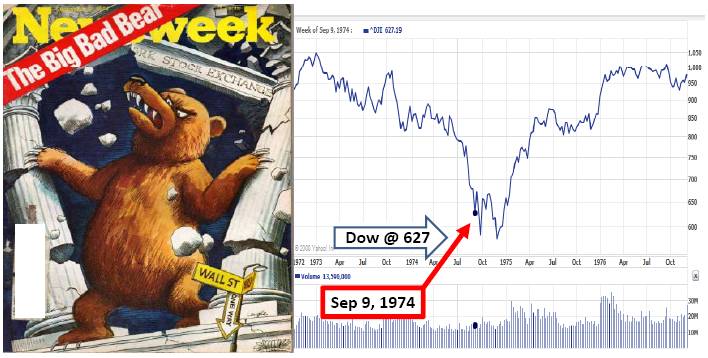 Newsweek’s “The Big Bad Bear” issue came out on September 9, 1974 when the collapse of the so-called “Nifty Fifty” (the concentrated set of glamour stocks or “Blue Chips”) was in full swing. This group of stocks, like Avon, McDonalds, Polaroid, Xerox, IBM and Disney, were considered “one-decision” stocks investors could buy and hold forever. Unfortunately, numerous of these hefty priced stocks (many above a 50 P/E) came crashing down about 90% during the1973-74 period.