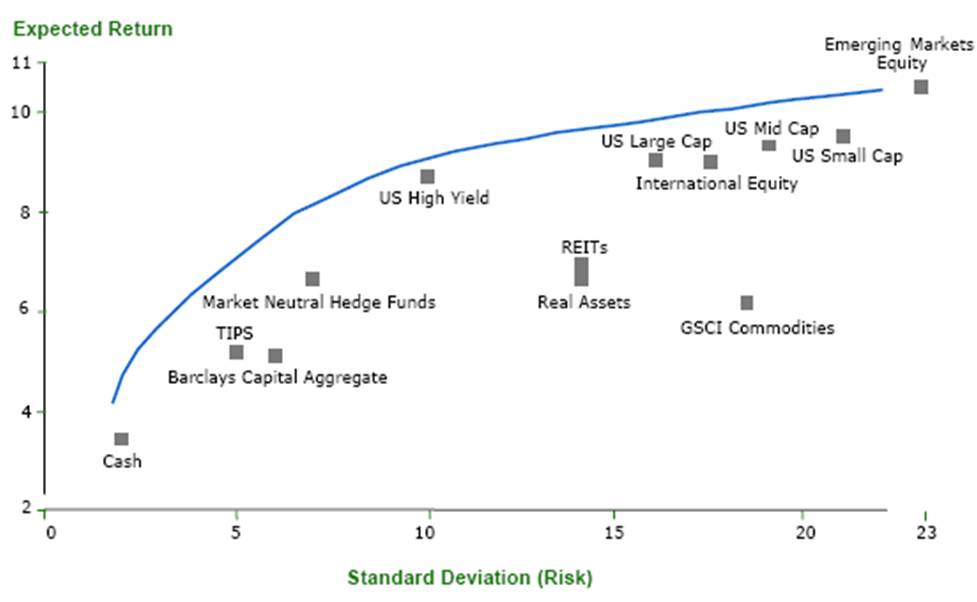 Correlation, which measures the price relationship between different asset classes, increased dramatically across asset classes in 2008, as the global recession intensified. However, over longer periods of time important diversification benefits can be achieved with a proper mixture of risky and risk-free assets, as measured by the Efficient Frontier (above). Conceptually, an investor’s main goal should be to find an optimal portfolio on the edge of the frontier that coincides with their risk tolerance.