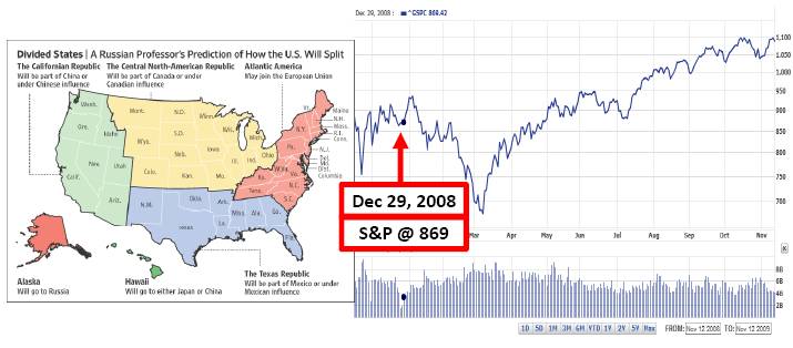 One of my favorite articles (read here) of the global crisis was written by The Wall Street Journal late last year about a Russian Professor, Igor Panarin (also a former KGB analyst). I find it absurdly amusing that the WSJ would even give credence to this story, but perhaps now I can look forward to an Op-Ed in their newspaper from Iranian President Mahmoud Ahmadinejad or North Korean Leader Kim Jong Ill. Not only did Professor Panarin pronounce the complete evaporation of the United States, but he also provided a specific timeframe. In late June or early July 2010, he expects the U.S. to fall into civil war and subsequently get carved up into six pieces by particular foreign regions, including China, Mexico, E.U., Japan, Canada, and Russia (which will control Alaska of course). I guess Sarah Palin will not be a happy camper?