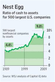 Despite the sluggish economic reports, corporate cash piles have been expanding (see “Nest Egg” chart), thanks to aggressive cost-cutting, stabilization in GDP numbers, and meager capital programs. As part of stingy CFOs and executives controlling expenses, companies have been slow to hire despite an expected two quarters of economic growth. Job hiring is likely to remain scarce since capacity utilization and capital expenditures will probably remain priorities before job payrolls expand. It may be that jobs were the first area cut as the crisis unfolded and the last aspect to rebound in the economic expansion.