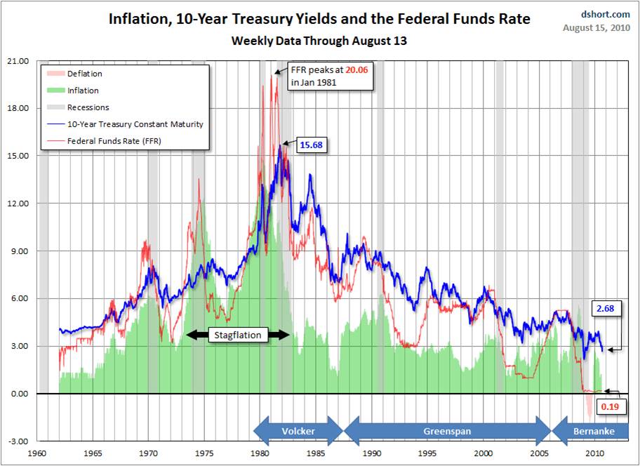What makes Siegel so nervous about bonds? Well for one thing, take a look at what interest rates have done over the last 30 years, with the Federal Funds rate cresting over 20%+ in 1981 (View RED LINE & BLUE LINE or click to enlarge):