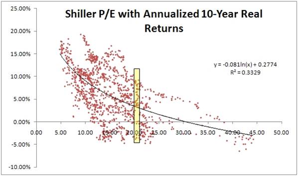 Robert Shiller is best known for his correctly bearish forecasts on the housing market, which we are continually reminded of through the ubiquitous Case-Shiller housing index, and his aptly timed 2000 book entitled Irrational Exuberance. Shiller is also well known for his cyclically adjusted 10-year price-earnings tool, also known as P/E-10. This tool chooses to take a rearview mirror look at the 10-year rolling average of the S&P composite stock index to determine whether the equity market is currently a good or bad buy. Below average multiples are considered to be predictive of higher future returns, and higher than average multiples are considered to produce lower future returns (see scatterplot chart).