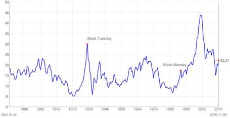 How good an indicator was P/E-10 for the proponent himself at the bottom of the market in February 2009? Shiller said he would get back in the market after another 30% drop in the ratio (click here for video). As we know, shortly thereafter, the market went on a near +70% upwards rampage. I guess Shiller just needs another -55% drop in the ratio from here to invest in the market?