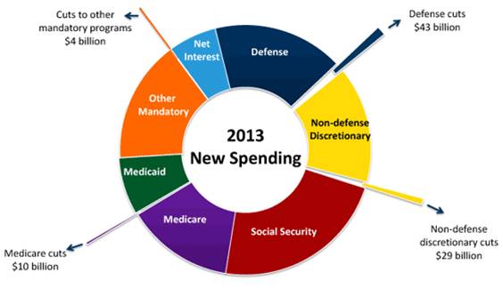 As you can see from the pie chart above, the $85 billion in spending cuts (small slivers) associated with the sequester represent a relatively small fraction of our country’s total $3.6 trillion federal budget. More specifically, the expenditure reductions equate to a meager 2.4% of 2013’s total spending tab.How is the $85 billion in painful spending medicine being administered? If Congress continues with this flawed solution, more than half of the cuts (~$43 billion) will come from defense spending (see also Impoverished Global Babysitter). For the balance of the cutbacks, discretionary spending is bearing the largest brunt of the austerity moves (~$29 billion). The main discretionary programs hit include scientific and medical research, national parks, education, food inspections, federal employee pay, law enforcement, grants to state and local governments, and the Head Start pre-school program. Notable exceptions to the reductions include military personnel, and Social Security beneficiaries. To a lesser extent, Medicare dollars will decline by about $10 billion, and a final miscellaneous mandatory program category will drop by approximately $4 billion.