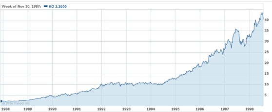 People generally refer to Warren Buffett as a “Value” investor, but in fact, despite the Ben Graham moniker, Buffett has owned some of the greatest growth stocks of all-time. For example, Coca Cola Co (KO) achieved roughly a 20x return from 1988 – 1998, as shown below: