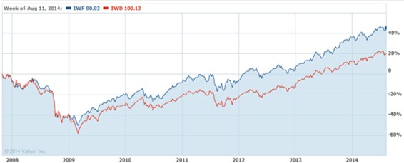 Ever since the technology bubble burst in 2000, Growth stocks have felt the pain. Since that period, the Russell 1000 Value index – R1KV (Ticker: IWD) has almost doubled in value and outperformed the Russell 1000 Growth index – R1KG (Ticker: IWF) by more than +60% (see chart below):
