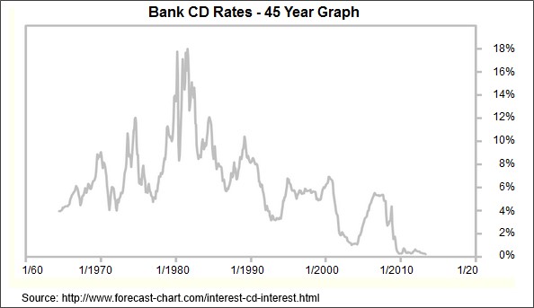 Compounding the never-ending pessimism problem is the near-0% interest rate environment. Times are long gone when you could earn 18% on a certificate of deposit (see chart below). Today, you can earn 0.08% on a minimum $10,000 investment in a Bank of America (BAC) Certificate of Deposit (CD). Invest at that rate for more than a decade and you will have almost accumulated a $100 (~1%) – probably enough for a single family meal…without tip. To put these paltry interest rates into perspective, the U.S. stock market as measured by the S&P 500 index was up a whopping +5.5% last month and the Dow Jones Industrials climbed +5.6% (+968 points to 18,133). Granted, last month’s S&P 500 percentage increase was the largest advance since 2011, but if I wanted to earn an equivalent +5.5% return by investing in that Bank of America CD, it would take me to age 100 years old before I earned that much!