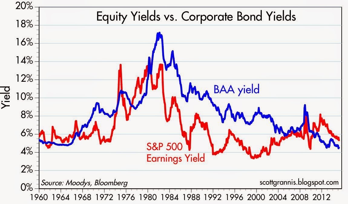 Declining interest rates have made stocks look attractive relative to investment grade corporate bonds too as evidenced by the chart below. As you can see, over the last half-century, corporate bond yields have predominantly offered higher income yields than the earnings yield on stocks – that is not the case today.