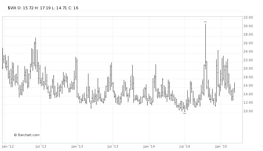 What does all this stock dividend, earnings yield stuff mean? In the grand scheme of things, income starving Baby Boomers and retirees are slowly realizing that stocks in general stack up favorably in an environment in which interest payments are going down and dividend payments are going up. One of the areas highlighting the underlying demand for stocks is the Volatility Index (VIX) – a.k.a., the “Fear Gauge.” Despite Greece, Russia, ISIS, the Fed, and the Dollar dominating the headlines, the hunger for yield and growth in a declining interest rate environment is cushioning the blow during these heightened periods of volatility (see also A Series of Unfortunate Events).