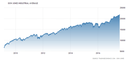Despite these impressive gains (see 2009-2017 chart below), overall, investors remain concerned. Rather than stock participants calmly enjoying the sun, breeze, and refreshingly cool waters of the current markets, many investors have been more concerned about getting sunburned to a geopolitical crisp; overwhelmed by an unexpected economic tsunami; and/or drowned by a global central bank-induced interest rate crisis.