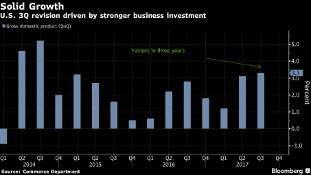 - Accelerating GDP Growth: As you can see from the chart below, broad economic growth, as measured by Gross Domestic Product (GDP), accelerated to a very respectable +3.3% growth rate during the third quarter of 2017 (the fastest percentage gain in three years). These GDP calculations are notoriously volatile figures, nevertheless, the recent results are encouraging, especially considering these third quarter statistics include the dampening effects of Hurricane Harvey and Irma.