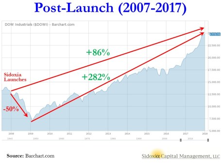 However, it wasn’t all rainbows and unicorns over Sidoxia’s first ten years (2007 – 2017). Despite the Dow advancing to 24,719 today from the 2009-low of 6,470, there were at least 11 substantial corrections (price drops) ranging from -5% to -22%. The extraordinary climb up the financial mountain included a “Flash Crash”, U.S. debt downgrade, eurozone economic crisis, Ebola scare, Brexit vote, multiple presidential elections, and China recession scares, among numerous other fear-grabbing headlines.