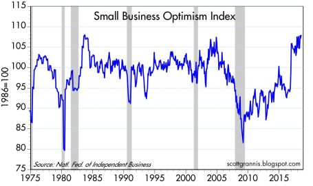 And jobs remain plentiful in part because of Small Business Optimism (see chart below). It’s common knowledge that small businesses generate the vast majority of new jobs, so these optimism levels hovering near 35-year highs augur well for future hiring, job growth, and investment.