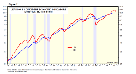 - Leading Economic Indicators are at a record high (a predictive statistic that historically falls before recessionary periods – in gray)