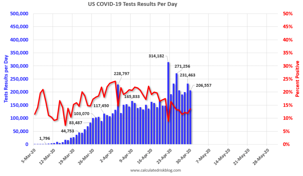 - Improving Healthcare System: Treatments for sick Covid patients has only gotten better, including new therapeutics like the drug remdesivir from Gilead Sciences Inc. (GILD). Dr. Anthony Fauci, the NIAID Director (National Institute of Allergy and Infectious Diseases) stated remdesivir “will be the standard of care.” With 76 vaccine candidates under development, there is also a strong probability researchers could discover a cure for Covid by 2021. With the help of the Defense Production Act (DPA), the government is also slowly relieving critical manufacturing bottlenecks in areas such as ventilators, PPE (Personal Protective Equipment) and Covid test kits. Making testing progress is crucial because this process is a vital component to reopening the economy (see chart below).