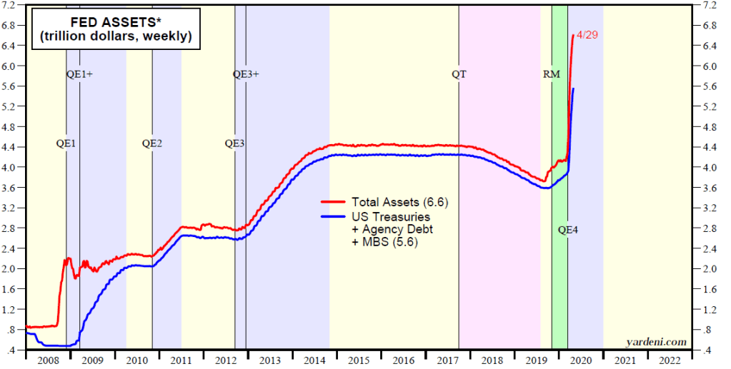 - Monetary Stimulus: The Federal Reserve has pulled out another monetary bazooka with the announcement of $2.3 trillion dollars in additional lending to small businesses . This action, coupled with the long menu of actions announced last month brings the total amount of stimulus dollars to well above $6 trillion (see also Recovering from the Coma for a list of Fed actions). You can see in the chart below how the Fed’s balance sheet has ballooned by approximately $3 trillion in recent months. The central bank is attempting to stimulate commerce by injecting dollars into the economy through financial asset purchases.