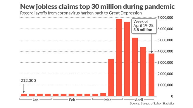 The Covid-19 viral pandemic that hit our shores in early 2020 shut down the economy to a virtual halt, and unemployment has skyrocketed to an estimated 19%, as 30 million people have now filed for unemployment benefits over the last six weeks (see chart below). Shockingly, we have not seen joblessness levels this high since the Great Depression. All this destruction has investors asking themselves, “What the heck, and what now?
