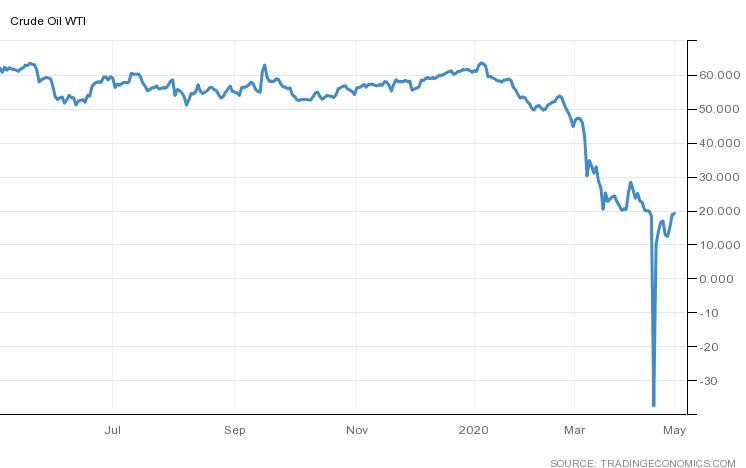 Certainly, there have been some industries hurt by Covid-19 more than others. At the top of the misery list are travel related industries such as airlines, cruise lines, and hotels. Retailers like Neiman Marcus, Pier 1, and JCPenney are filing for bankruptcy or on the verge of closing. Restaurants have also been pummeled (partially offset by the ability to offer pickup and delivery services), and entertainment industries such as sporting arenas, concert venues, movie theaters, and theme parks have all painfully come to a screeching halt as well. Let’s not forget energy and oil companies, which are battling for their survival life in an environment that has witnessed oil prices plunge from $61 per barrel at the beginning of the year to $19 per barrel today (with a brief period at negative -$37…yes negative!) – click here for an explanation and see the chart below.