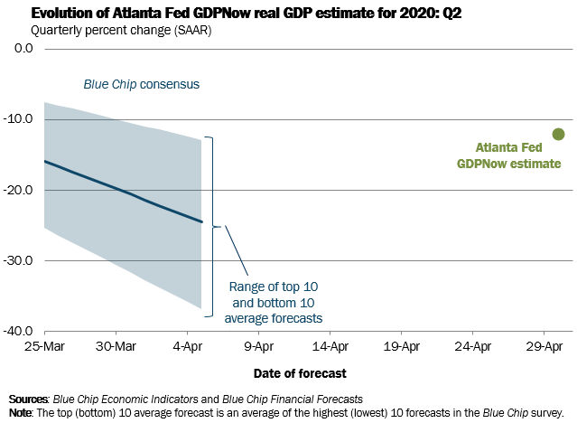 Forecasts for 2nd quarter economic activity (Gross Domestic Product) are estimating an unprecedented decline of -12% (see chart below) with some projections plummeting as low as -34%. Despite the dreadful freefall in the stock market during March, along with the pessimistic economic outlook, the major stock indexes came back with a vengeance during April. More specifically, the Dow Jones Industrial Average soared +2,428 points, or +11% for the month. The other major indexes, S&P 500 and NASDAQ, catapulted higher over the same period by +13% and +15%, respectively.