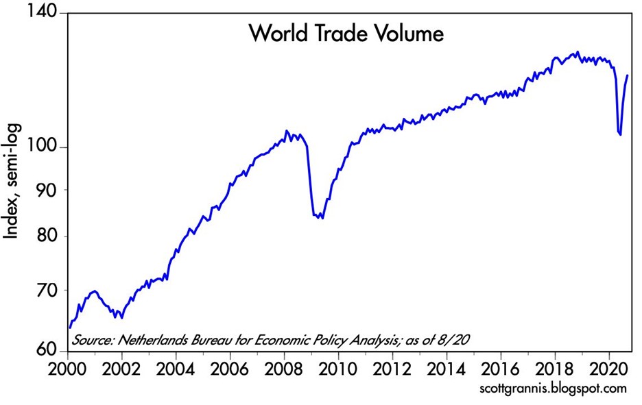 The economic resurgence experienced has not been limited to the United States. The global expansion, especially in China, has shown up in the upturn of World Trade Volume (see chart below).