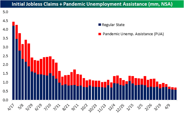 A germinating economy also means a healthier employment market and more jobs. The chart below shows the dramatic decline in the number of jobless receiving benefits and pandemic unemployment assistance.