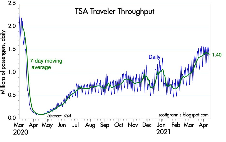 As the economy further re-opens and pent-up consumer demand is unleashed, activity is sprouting up in areas like airlines, hotels, restaurants, bars, movie theaters and gyms. An example of consumer demand climbing can be seen in the volume of passenger traffic in U.S. airports, which has increased substantially from the lows a year ago, as shown below in the TSA (Transportation Security Administration) data.