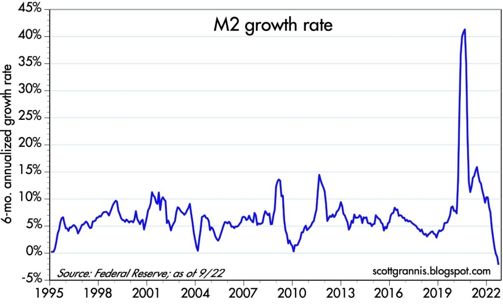 Another positive development supporting climbing stock prices relates to what I have been writing about for quite some time – peaking and declining inflation numbers. Scott Grannis at Calafia Beach Pundit has done a great job of explaining how monetary policy (M2 – see chart below) and fiscal stimulus, during the peak-COVID era (combined with supply chain disruptions), have fed the explosion in monetary supply growth, which directly relates to the spiking inflation we all have experienced. Thankfully, the shift from a looser COVID monetary policy to a tighter monetary policy (i.e., Quantitative Tightening and rate hikes), in conjunction with less government spending (i.e., improving government deficit), has led to a dramatic drop in money supply growth (actually negative growth), hence creating a better outlook for inflation.
