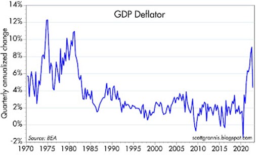 Although inflation still has a long way to go before reaching the Federal Reserve’s 2% target rate, broad inflation measures, such as the GDP Deflator, are showing a significant decrease in inflation (see chart below). By analyzing the various disinflationary tea leave markers, we can gain some confidence regarding future interest rates. Observing the fastest rate hike cycle by the Fed in decades informs us that we are likely closer to an end of rate hikes (i.e., pause or cut), rather than the beginning. If correct, tamer inflation means 2023 could prove to be a better environment for both stock and bond investors.