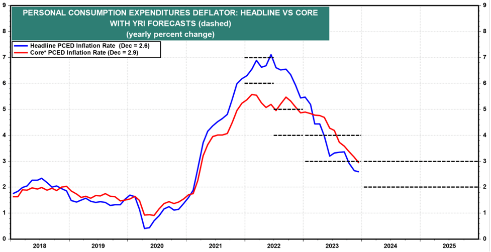 Inflation dropping (see chart below), the Federal Reserve signaling a decline in interest rates, low unemployment (3.7%), and healthy economic growth (+3.3% Q4 – GDP) have all contributed to the continuing bull market run.