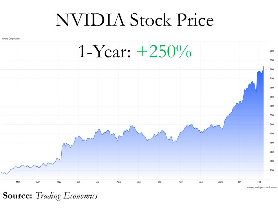 The weather may be cold during winter, but stocks were scorching hot last month, fueled in part by the surge in performance from AI (Artificial Intelligence) stocks. More specifically, the Dow Jones Industrial Average was up +2.2% to 38,996. The S&P 500 surged +5.2% to 5,096. And the AI-heavy Nasdaq index climbed the most by +6.1% to 16,092.