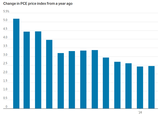 And when it comes to the all-important inflation data, the Federal Reserve’s preferred inflation measure, Core PCE index (Core Personal Consumption Expenditures), was also just released in-line with economists’ projections at 2.5% (see chart below), very near the Fed’s long-term 2.0% inflation target and well below the Core PCE’s recent peak near 6%.