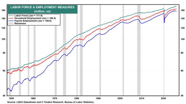 However, there is a silver lining to that perspective. While software jobs have flattened since ChatGPT arrived in late 2022, we have yet to see the “cliff dive” in total employment that many predicted. In fact, employment (165 million employed) and labor force (172 million) figures are near record levels, so we have not seen AI kill the economy quite just yet (see chart below).