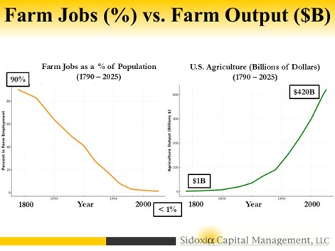 It is easy to get lost in the dystopian narrative, but history offers a more hopeful guide. Technology has been replacing human workers for centuries—from the looms of the Industrial Revolution to the tractors of the Agricultural Revolution – see chart below (1790 – 2025). In every instance, while specific roles were displaced, new industries emerged that not only soaked up the unemployed but expanded the labor force into areas we couldn’t have previously imagined (see also The Fallacy Behind Technological Innovation).