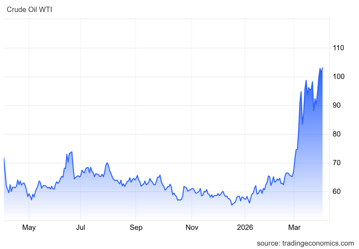 Basic economics dictates that when supply is choked, prices skyrocket. We saw exactly that: WTI Crude spiked roughly +54% over the last month, surging from $67 to a peak near $103 per barrel (see chart below).