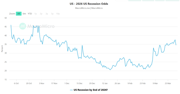 - Recessionary Red Flags: Prediction markets like Polymarket now place the probability of a U.S. recession by the end of 2026 at 34.5%, up significantly from just a few months ago (see chart below).
