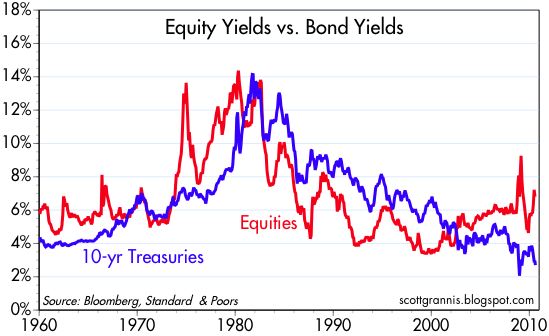 Siegel is not the only observer who sees relatively less value in bonds (especially government bonds) versus stocks. Scott Grannis, author of the Calafia Report artfully shows the comparisons of the 10-Year Treasury Note yield relative to the earnings yield on the S&P 500 index: