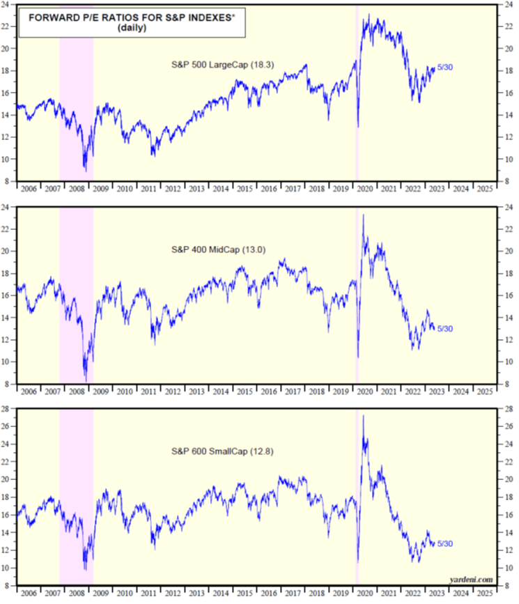While most stocks have dramatically underperformed technology stocks this year, this phenomenon can be explained in a few ways. First of all, smaller companies are more cyclically sensitive to an economic slowdown, and do not have the ability to cut costs to the same extent as the behemoth companies. The majority of stocks have factored in a slowdown (or mild recession) and this is why valuations for small-cap and mid-cap stocks are near multi-decade lows (12.8x and 13.0x, respectively) – see chart below.