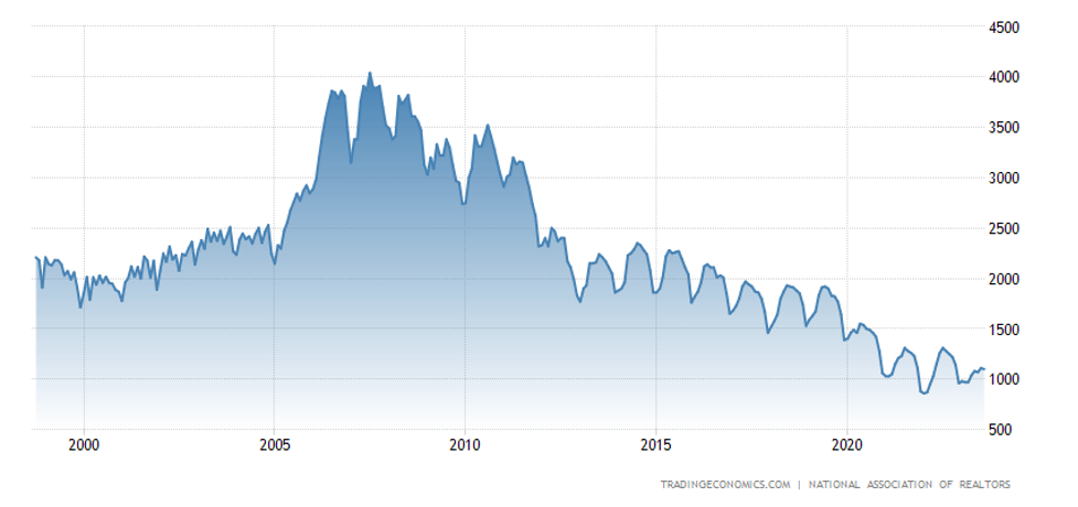 The embedded economic disincentive of selling a home with a mortgage has really put a real crimp on the supply of homes available for sale (chart below). As you can see, the inventory of homes has dramatically collapsed from a peak of about four million homes, circa the 2008 Financial Crisis, to around one million homes today.