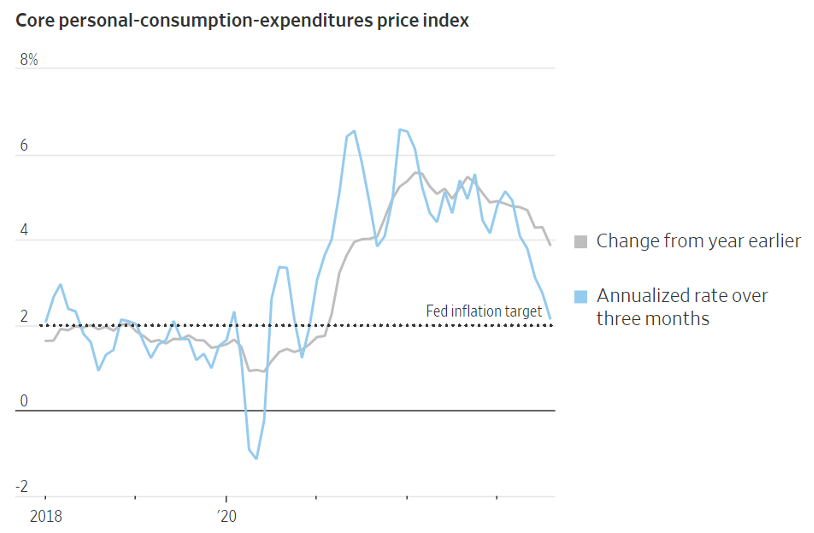 The Fed continues to talk tough about fighting inflation after taking interest rates from 0% to 5.5% over the last two years, nevertheless inflation continues to come down. The Fed’s go-to Core PCE inflation datapoint that came out last Friday at +0.1% is consistent with the downward inflation trend we have been witnessing for many months now (see chart below). As you can see, inflation on annualized basis has reached 2.2%, nearly achieving the Federal Reserve’s target of 2.0%.