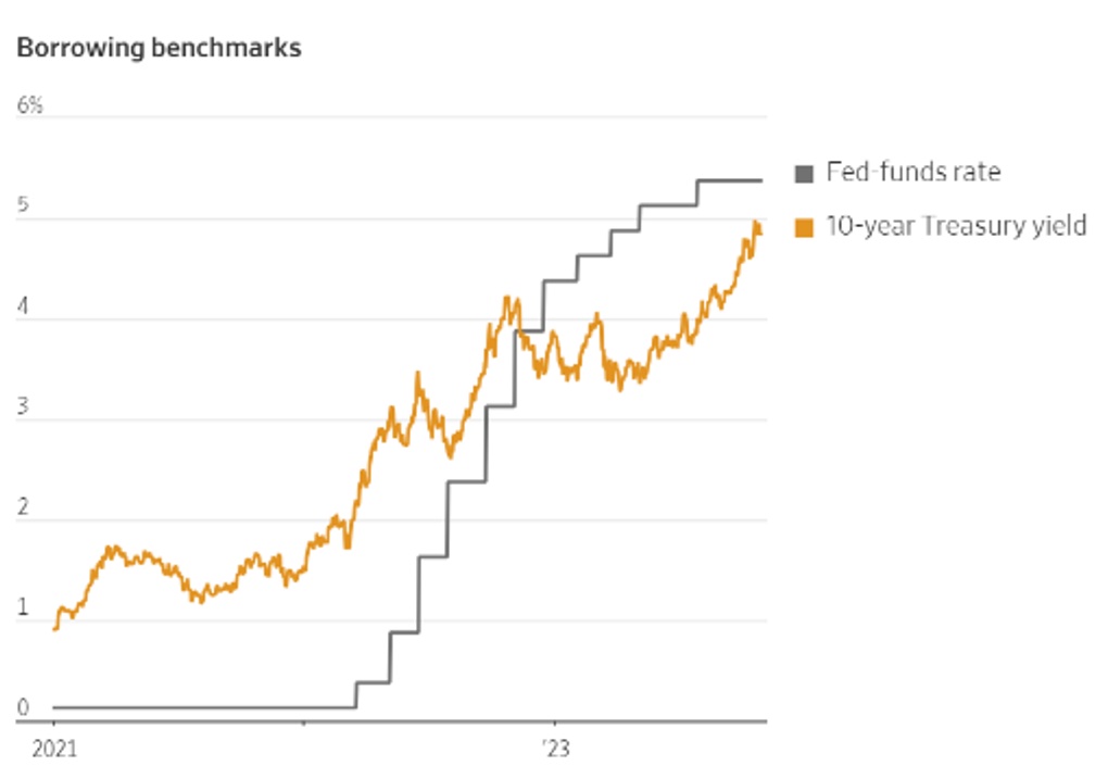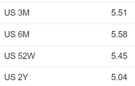 Given the large increase in interest rates by the Federal Reserve over two years (from 0% to 5.50%), investors have been given a short-term gift. As you can see from the chart above, yields on 10-Year Treasury Notes have risen to almost 5.0%. And believe it or not, shorter term bonds are currently providing yields even higher than this. The three-month, six-month, one-year, and two-year Treasuries are all yielding higher rates than 10-Year Treasury yields (i.e., inverted yield curve) – see table below. So, TINA has changed to FIONA – Fixed Income Opens New Alternatives. What’s more, for individuals with taxable accounts, the interest earned on Treasuries is tax-free at the state level, thereby making this short-term gift in yields even more attractive for investors.