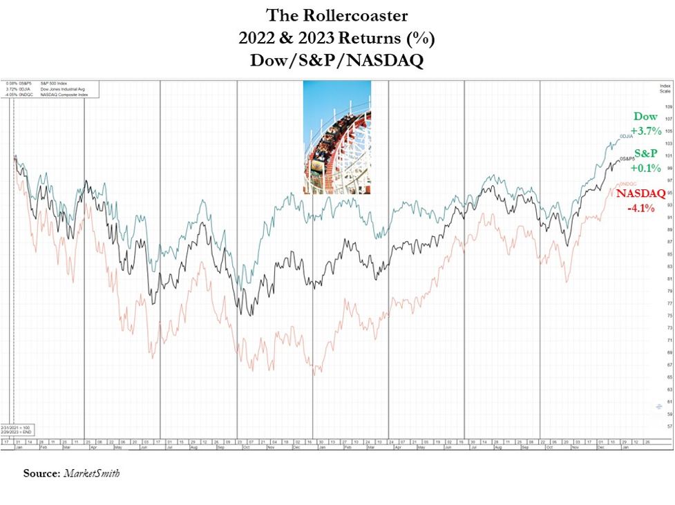To sum it up simply, the last two years have been like riding a rollercoaster. For the year just ended, much of the year felt like a party, but 2022 felt more like a funeral. When you add the two years together, it was more of a lackluster result. For 2022-2023 combined, results registered at a meager +0.1% for the S&P, +3.7% for the Dow, and -4.0% for the NASDAQ (see chart below).