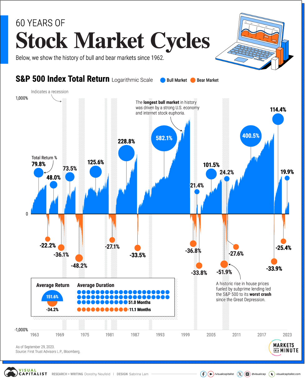 For those saying the good times of 2023 cannot continue, investors should understand that history paints a different picture. As you can see from the stock market cycles chart (below) that spans back to 1962, the average bull market lasts 51 months (i.e., 4 years, 3 months), while the average bear market persists a little longer than 11 months. This data suggests the current one-year-old baby bull market has plenty of room to grow more.