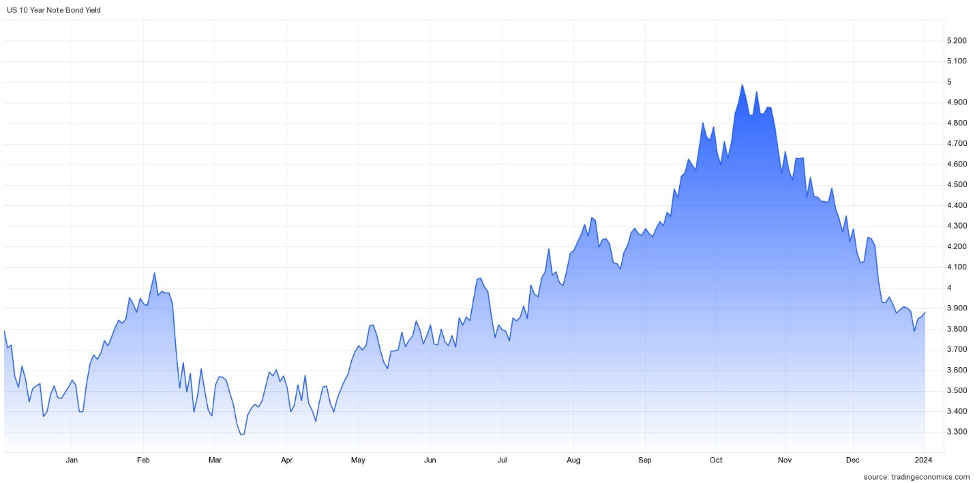 This interest rate cycle headwind has turned into a tailwind as investors now begin to discount the probability of future rate cuts in 2024. The relief of lower interest rates can be felt immediately, whether you consider declining mortgage and car loan rates for consumers, or credit line and corporate loan rates for businesses. This trend can be seen in the benchmark 10-Year Treasury Note yield, which has declined from a peak of 5.0% a few months ago to 3.9% today (see chart below).