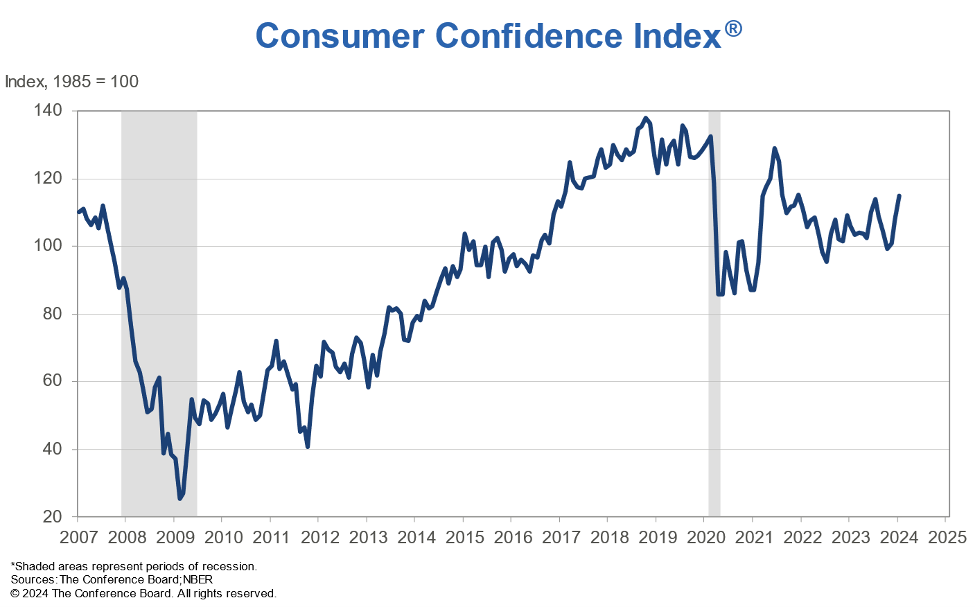 Consumer spending is the number one driver of economic growth, and consumers remain relatively confident about future prospects as seen in the recently released Conference Board Consumer Confidence numbers released this week (see chart below).