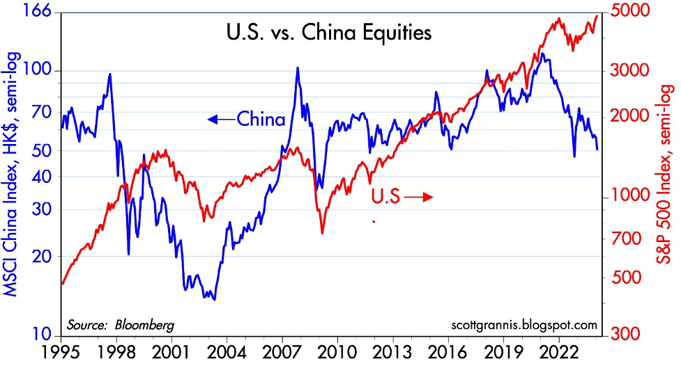 Well, as you can see in the chart below, anti-democratic, anti-American business, and confrontational military policies instituted by China have not benefitted investors – the U.S. stock market (S&P 500) has trounced the Chinese stock market (MSCI) over the last 30 years.