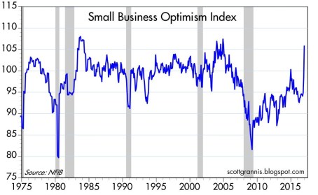 Pessimists, on the other hand, believe all these proposed initiatives will fail, and cause financial markets to fall into a tailspin. Regardless, at least for the period following the elections, investors and companies have perceived the pro-business rhetoric, executive orders, and regulatory relief proposals as positive developments. It’s widely understood that small businesses supply the largest portion of our nation’s jobs, and the upward spike in Small Business Optimism early in 2017 is a welcome sign (see chart below).