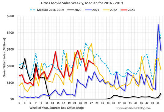 According to scientists, July set a record as the hottest month in 120,000 years. In order to beat the scorching heat, millions of Americans made the pilgrimage to their local air-conditioned movie theaters to watch the combo-blockbuster “Barbenheimer” (Barbie and Oppenheimer), which has raked in sales of more than $1 billion globally in the first two weeks of its release. Thankfully, in the short-run, Barbenheimer has given a shot in the arm to the beleaguered movie industry that suffered dramatically during the pandemic. The chart below (before Barbenheimer) shows industry sales have recovered (red line) somewhat, almost to pre-pandemic averages (dashed light blue line), but still has some ground to gain before industry sales consistently outpaces pre-pandemic levels.