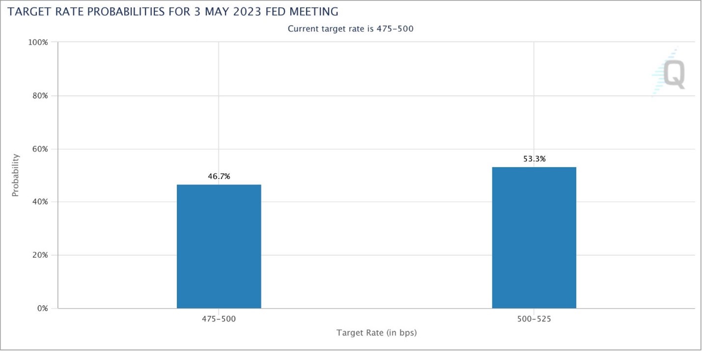 Regardless of the economic outcome, investors are now predicting the Federal Reserve to be at the end or near the end of its interest rate hiking cycle. Presently, there is roughly a 50/50 chance of one last 0.25% interest rate increase in May (see chart below), and then investors expect at least one interest rate cut by year-end.