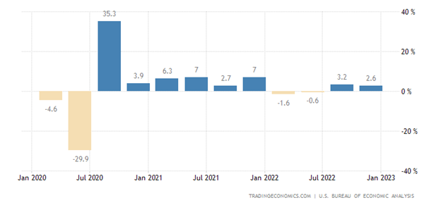 Many pundits have been predicting the U.S. economy to crash into a recession as a result of the aggressive, interest rate tightening policy of the Federal Reserve. So far, Mark Twain would probably agree that the death of the U.S. economy has been greatly exaggerated. Currently, the first quarter measurement of economic activity, GDP (Gross Domestic Product), is estimated to measure approximately +2.0% after closing 2022’s fourth quarter at +2.6% (see chart below). As you probably know, a definition of a recession is two consecutive quarters of negative GDP growth.